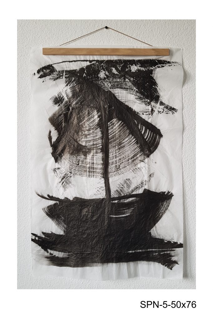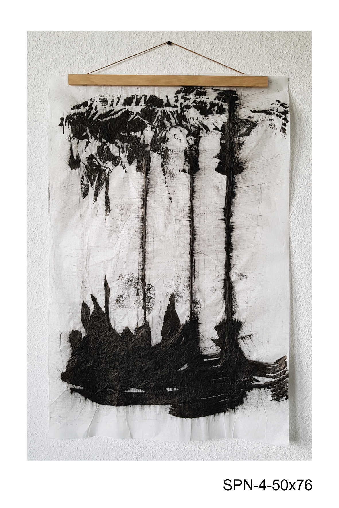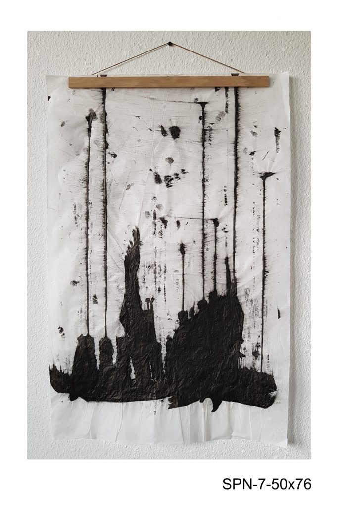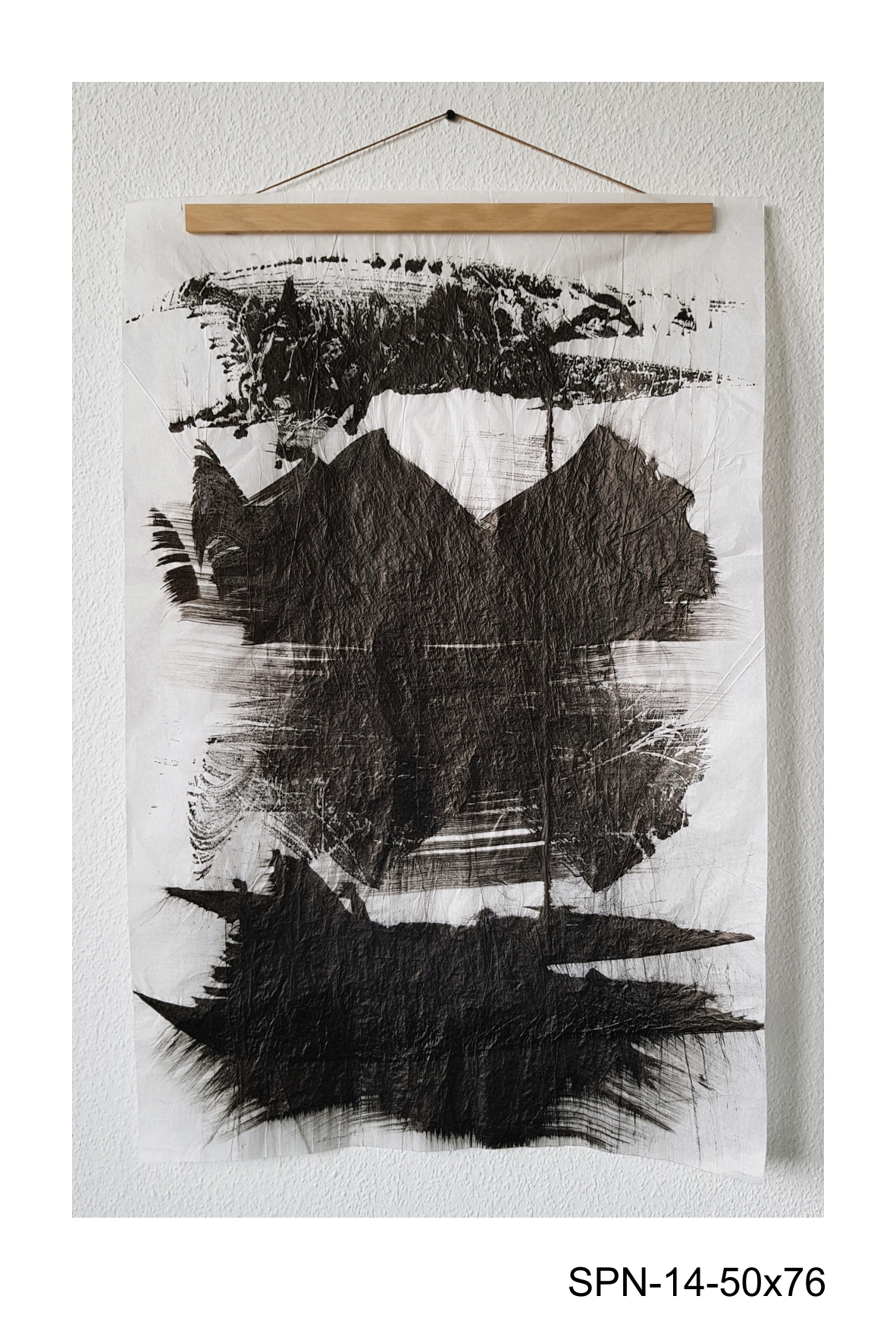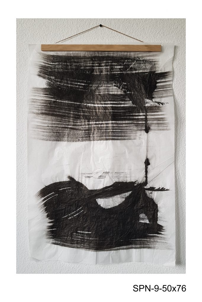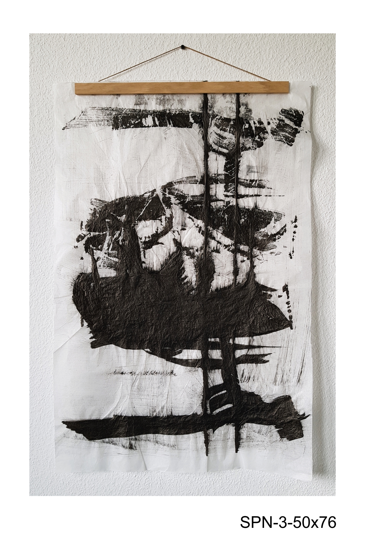 Schwarze Pigment-Tusche auf Seidenpapier. Das Seidenpapier ist sehr dünn und verzieht und wölbt sich nach der Trocknung entsprechend. Die Oberfläche ist nicht versiegelt. Die Papiere benötigten zum Schutz einen Rahmen mit Glas.