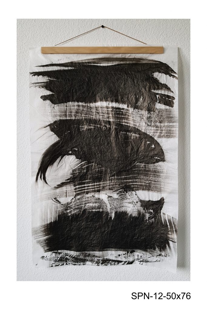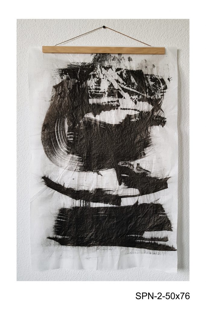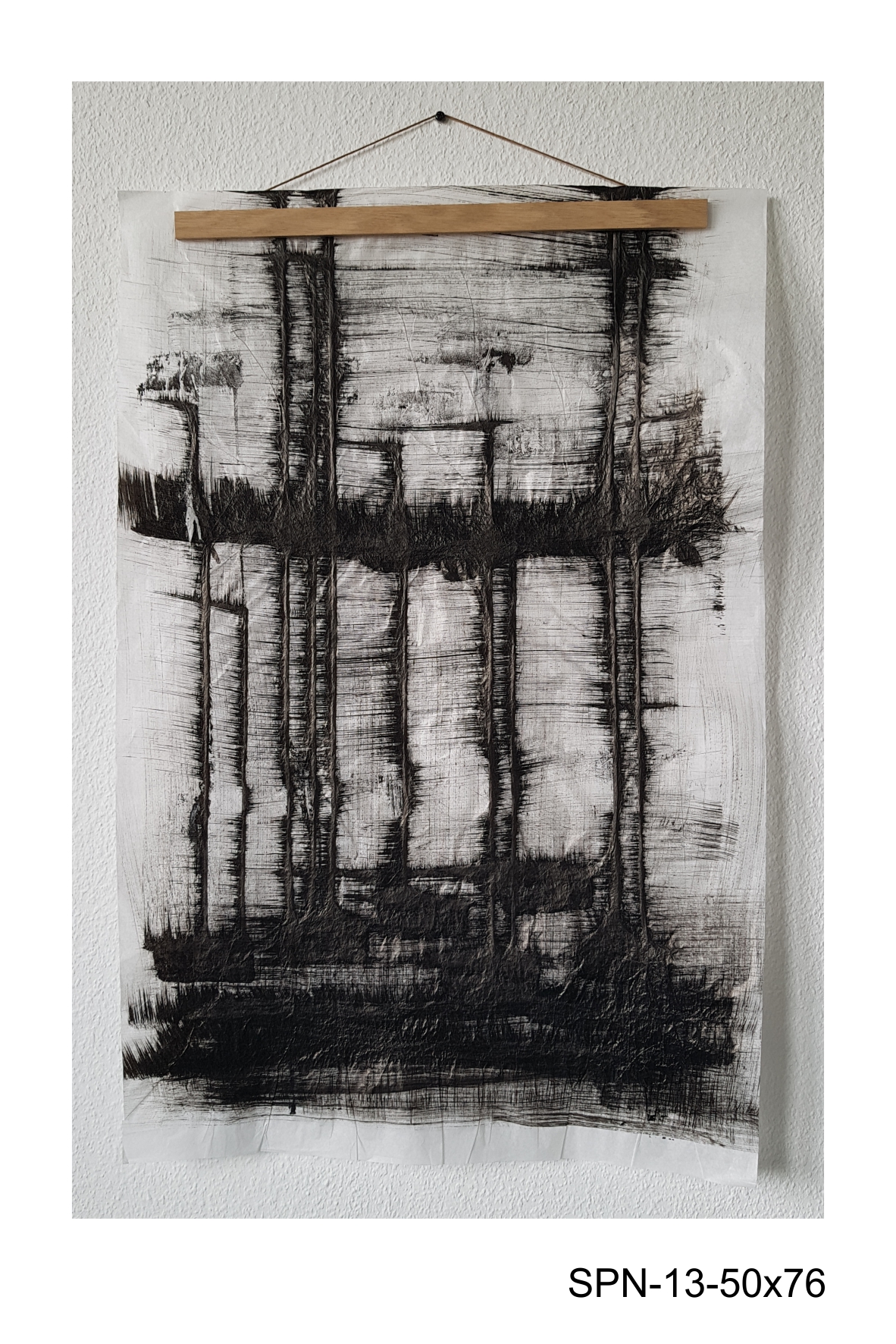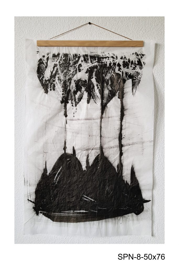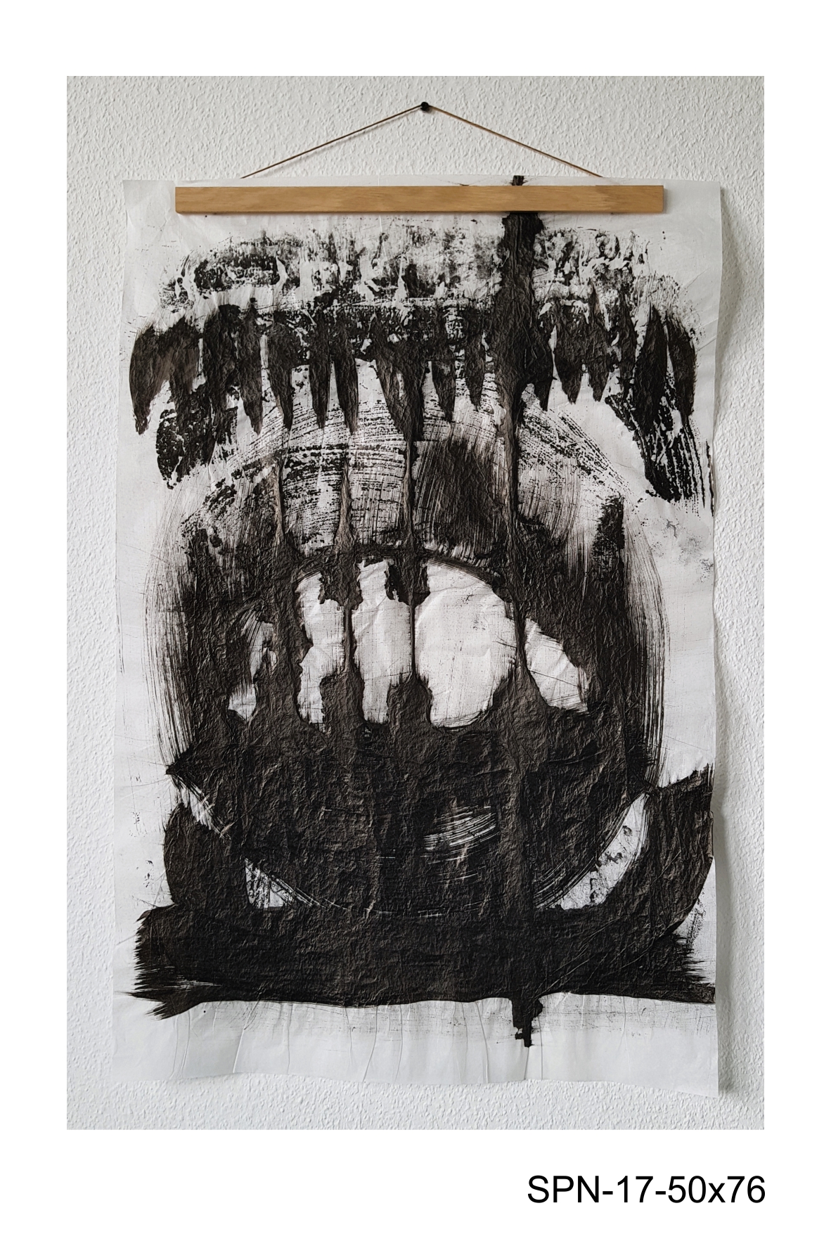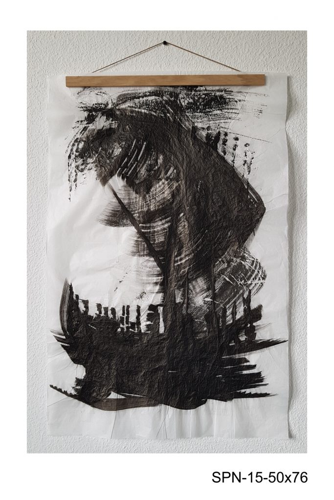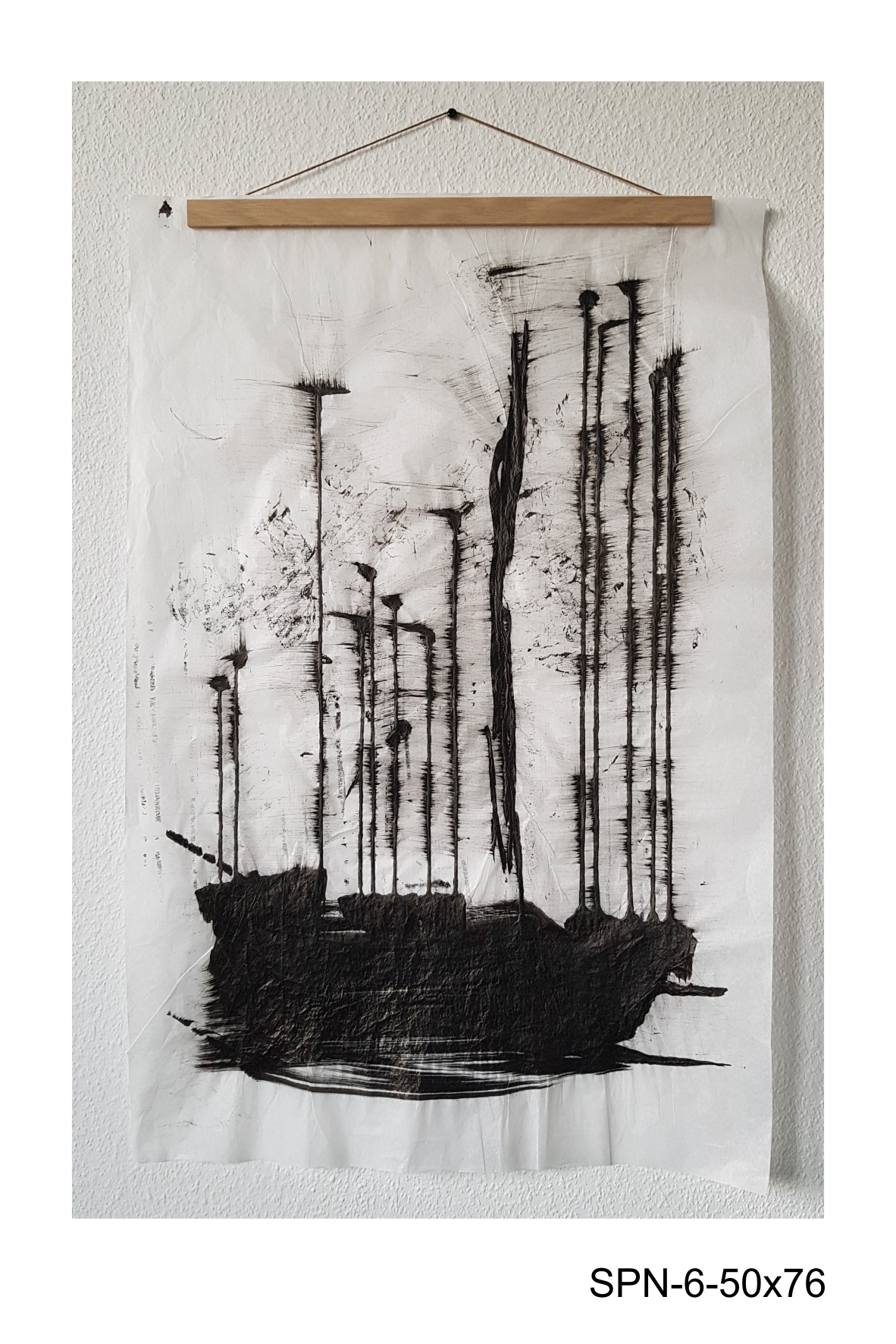 Schwarze Pigment-Tusche auf Seidenpapier. Das Seidenpapier ist sehr dünn und verzieht und wölbt sich nach der Trocknung entsprechend. Die Oberfläche ist nicht versiegelt. Die Papiere benötigten zum Schutz einen Rahmen mit Glas.