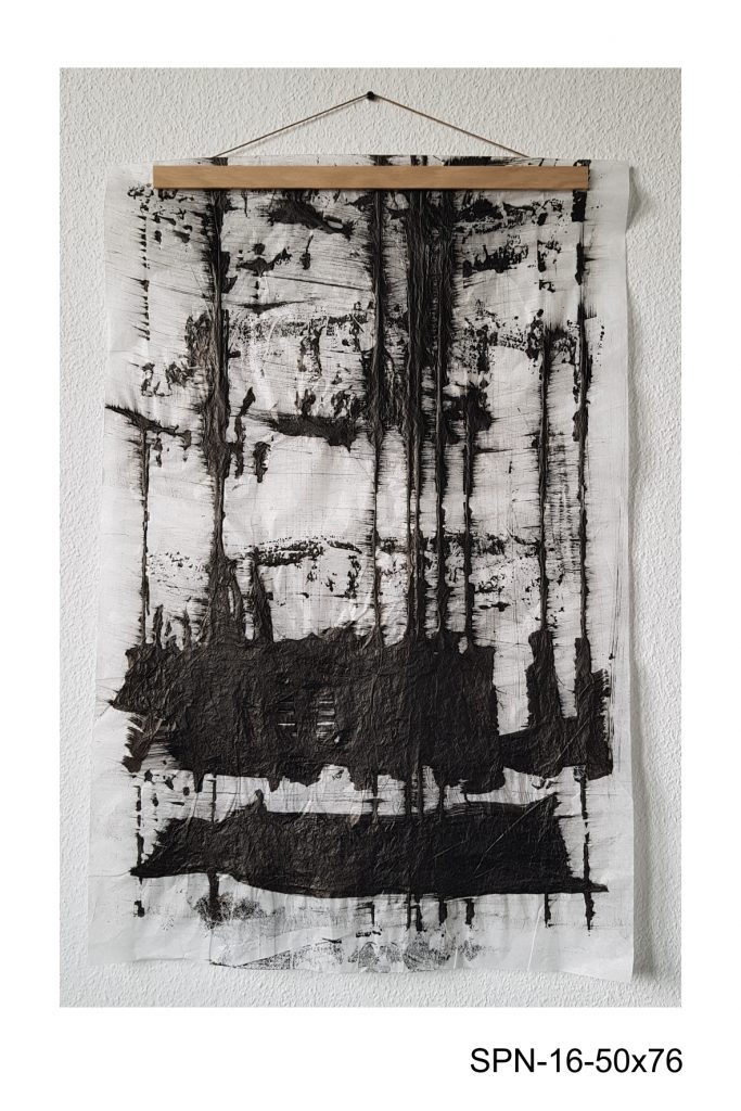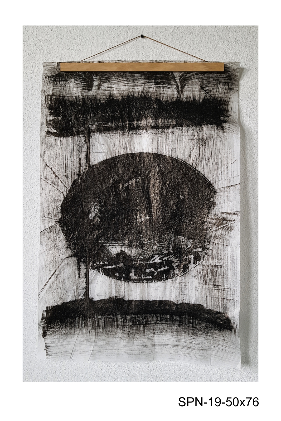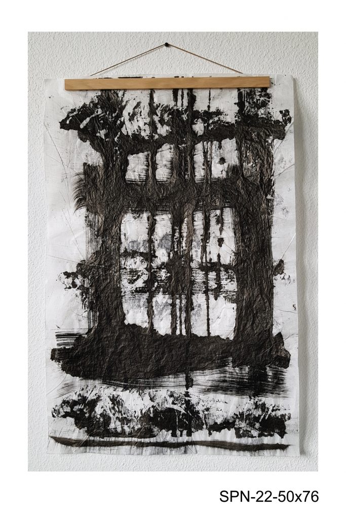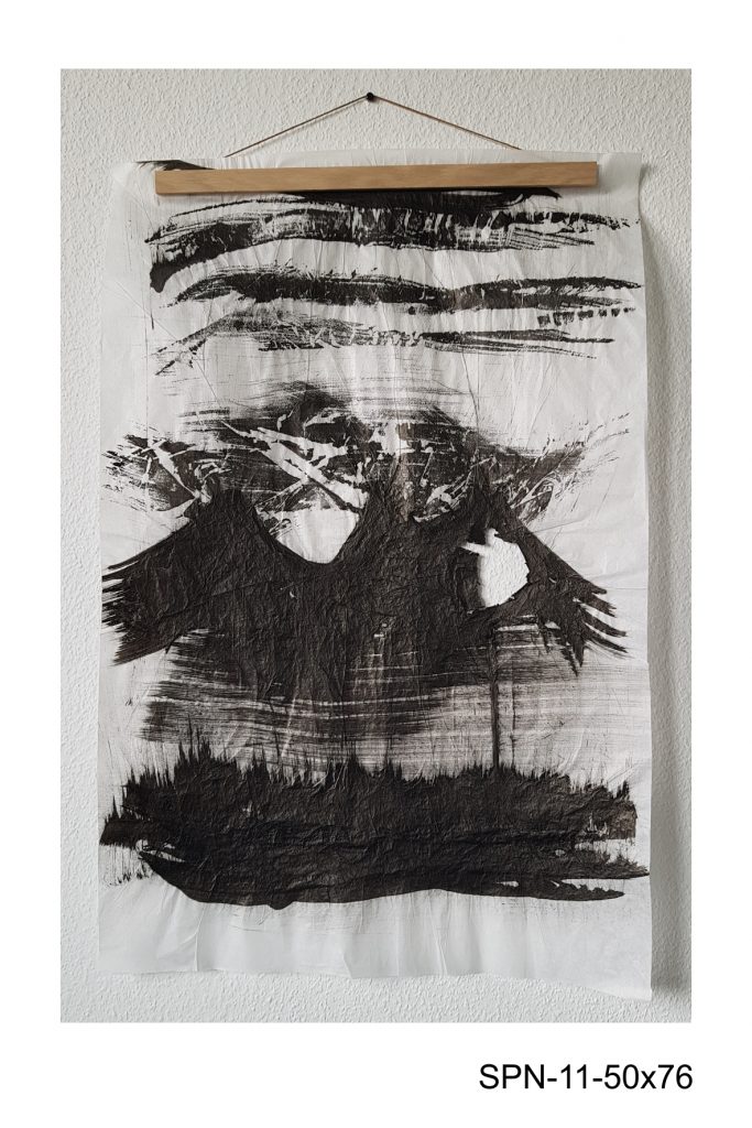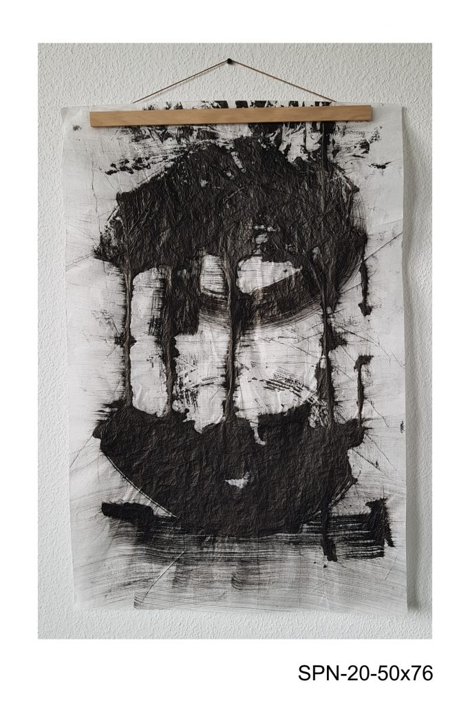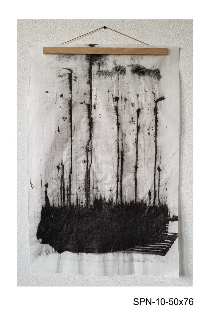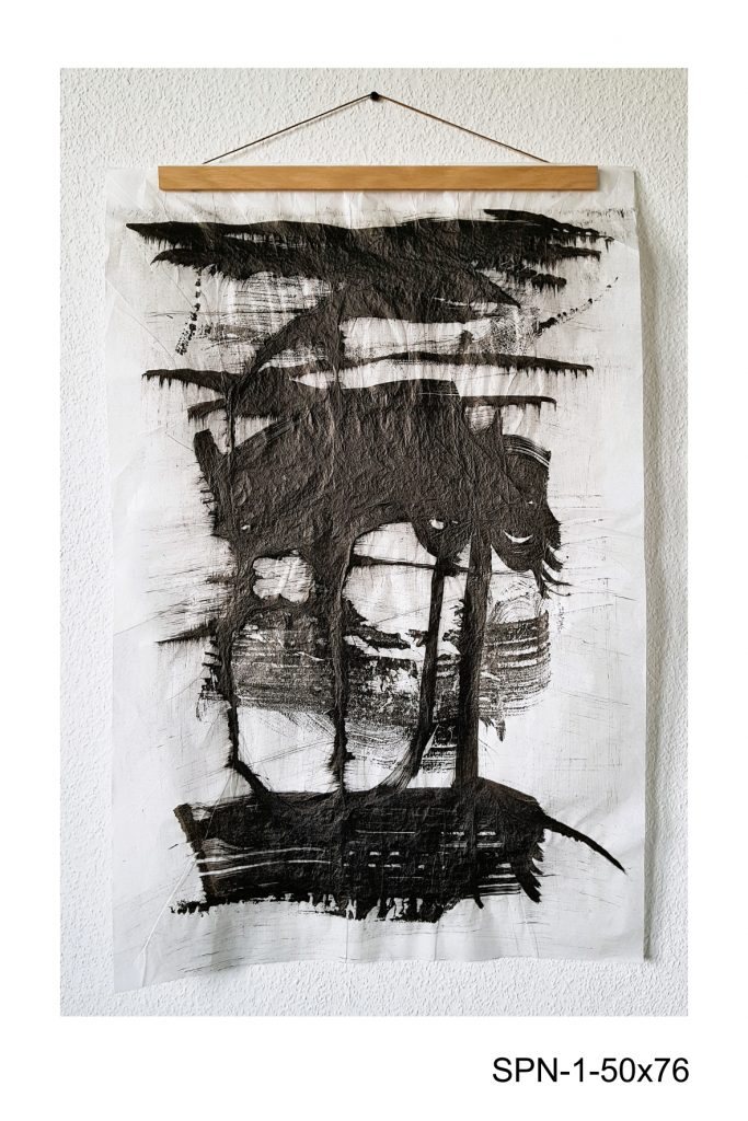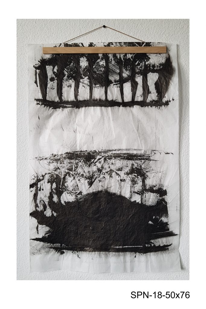 Schwarze Pigment-Tusche auf Seidenpapier. Das Seidenpapier ist sehr dünn und verzieht und wölbt sich nach der Trocknung entsprechend. Die Oberfläche ist nicht versiegelt. Die Papiere benötigten zum Schutz einen Rahmen mit Glas.